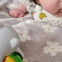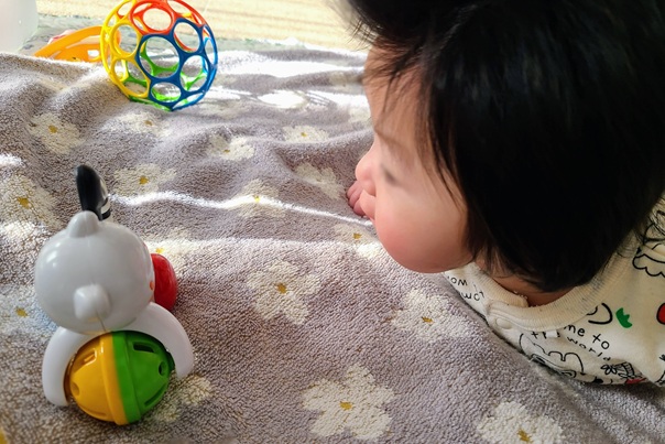 目の前に玩具や鏡を置くと、一生懸命に頭を持ち上げて見てくれます😊